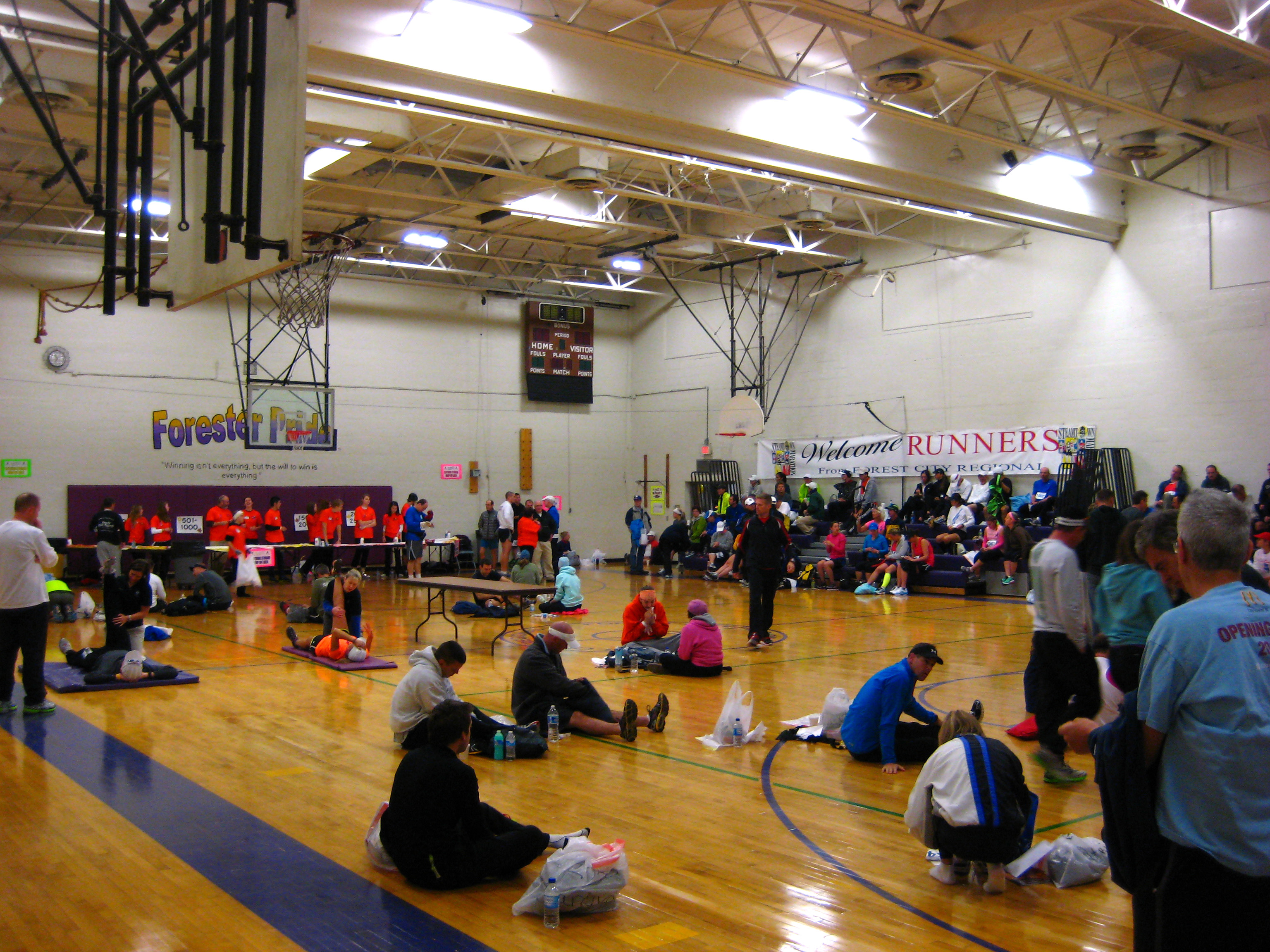 In the gym at the Forest City High School, we took care of last minute details, including, of course, a trip or two to the porta-john. Interestingly, they had separate units for men and women, which, I’m sure, made the women very happy, since we guys are not exactly neat and tidy. The runners were filing in, past the cheerleader brigade out front, the friendly students handing out coffee and hot chocolate, and the busy looking officials. For a smaller marathon, they do know how to make us comfortable. My impression at the expo was again confirmed, that everyone of the assembling runners looked like they were fit and ready.