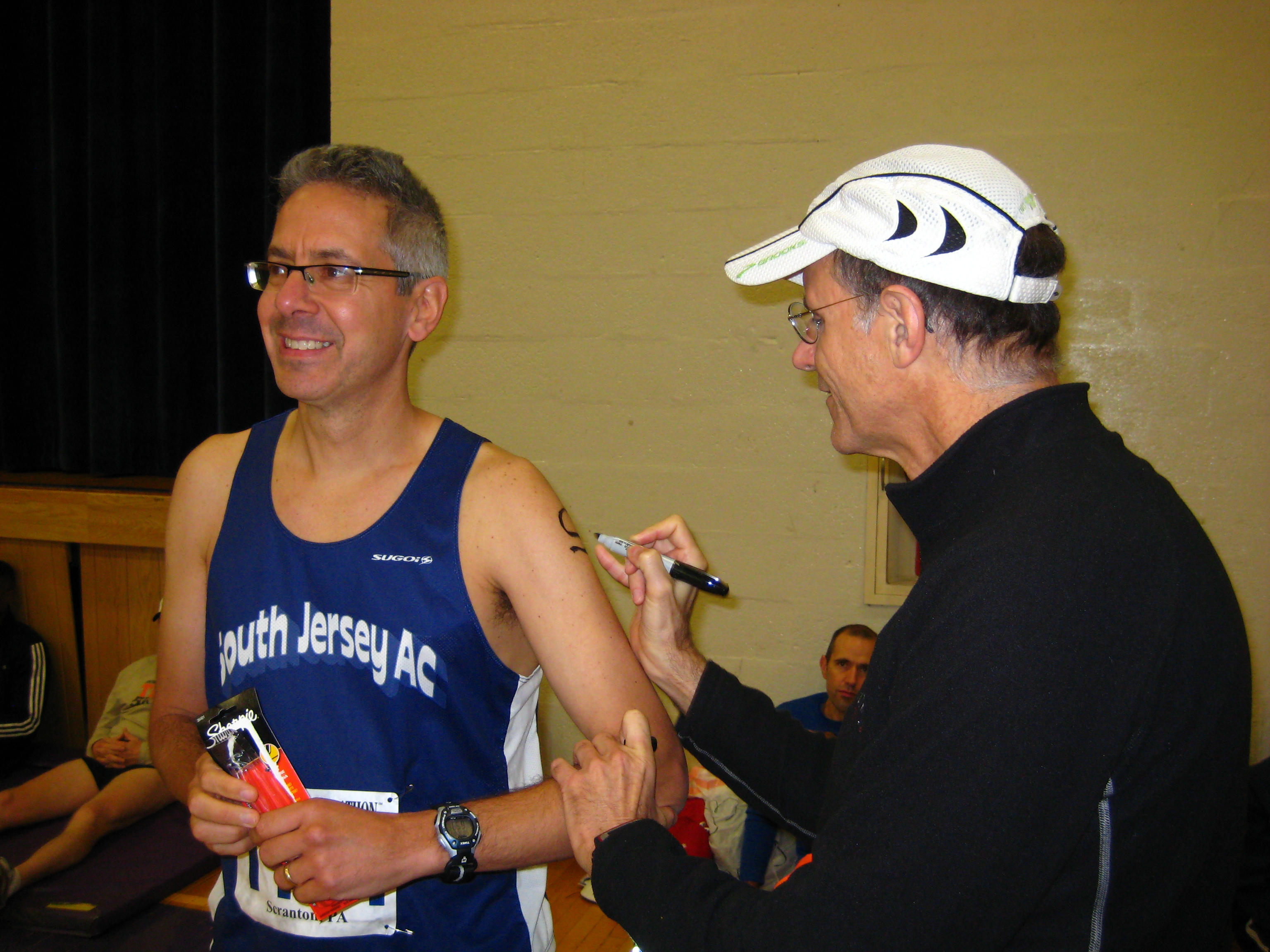 The race started off close to the planned start of 8 AM. Fortunately for us all, the rain stayed away for the entire race. The temperature at the start was about 40 deg., and it warmed up to about 50 by the end. True to all the stories we had heard from former runners, the start is a very steep drop down hill. The net drop in the first 10 miles is about 900 feet, and one really gets sucked in to the speed one gets from letting it rip down hill. I noticed that at the halfway mark, while I was still hanging with Tony, my half marathon time was faster than any half marathon I’ve run, just under 1:45. Ed, from SJAC, warned us about going out too fast. My feeling was that to slow down also takes a big toll on the muscles, from the braking action, so you are damned either way. Just past the half marathon mark, the run gets into a rolling hill, up and down, mode. It heads into the woods over graveled trails, which I found hurt my feet. By sixteen miles, I had given up all my time savings and started to really slow down. My legs were in pain, and I was starting to get some twitches in my calf muscles. Between the pain building in my muscles and the twitches turning in to real cramps, I could see my time goal not just slipping away, but having left the station a long time ago. So, what to salvage? By the way, Tony had steadily moved forward at the halfway mark and it was the last I saw of him until the finish line. Leaving the last of the trails in the woods, we continued on rolling roads as we headed toward Scranton. I had the honor of running beside “Hizzoner” Mayor Chris and his wife Donna, of Scranton, who were both looking very good over the last several miles. As we ran along, the crowds grew large, and their support for their mayor was tremendous. I got energized by their loud cheers for their mayor, pretending it was for me, which really helped drive me to the finish. Over the last two miles I was getting some very strange cramps in my left leg causing my foot to twist almost sideways. I’m sure I had a bit of a Quasimodo look as I headed up the remaining climb to the finish line. Crossing the finish line, I was barely able to lift my arms to shoulder height, trying unsuccessfully to look good for the camera. I finished in 3 hours, 57 minutes and 11 seconds. My personal best is 3:44:14, so I didn’t make a PR, and I certainly didn’t make my Boston Qualifier. But, I finished under four hours, and I was happy to have done so. Tony was brilliant, finishing in 3:39:06, under the Boston standard of 3:40 for his (and my) age group. He was very depleted at the end of the race, as were we all, although I think he was worse off than the rest of us. Steve finished in a very respectable 3:45:34, not what he wanted, but then, it’s a tough race.