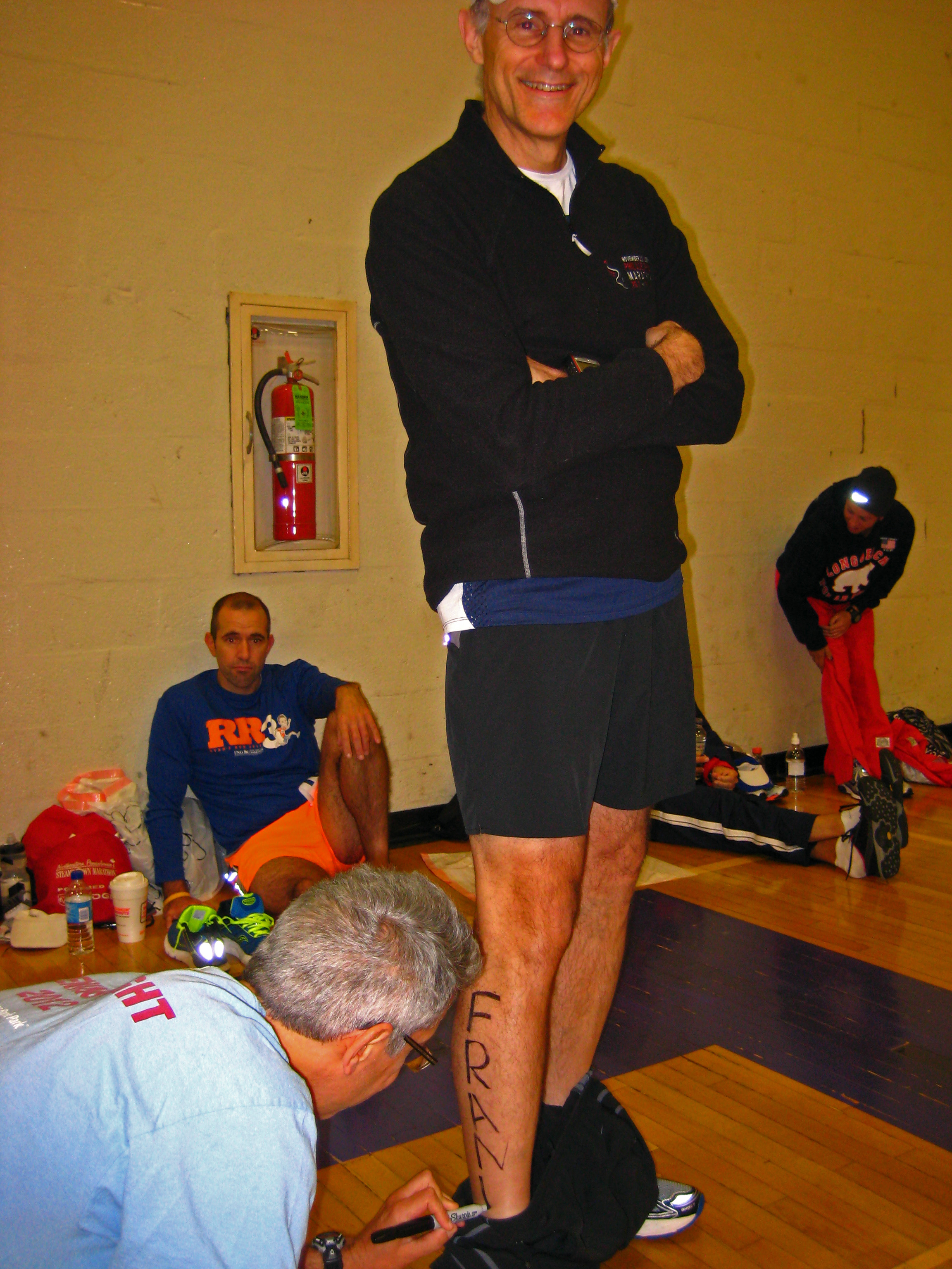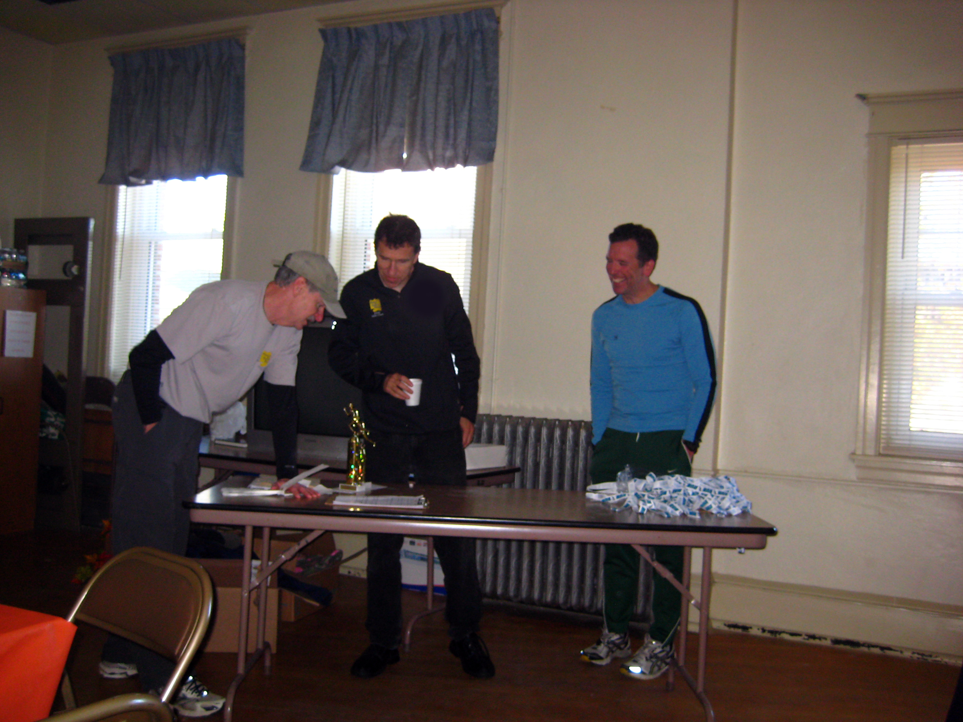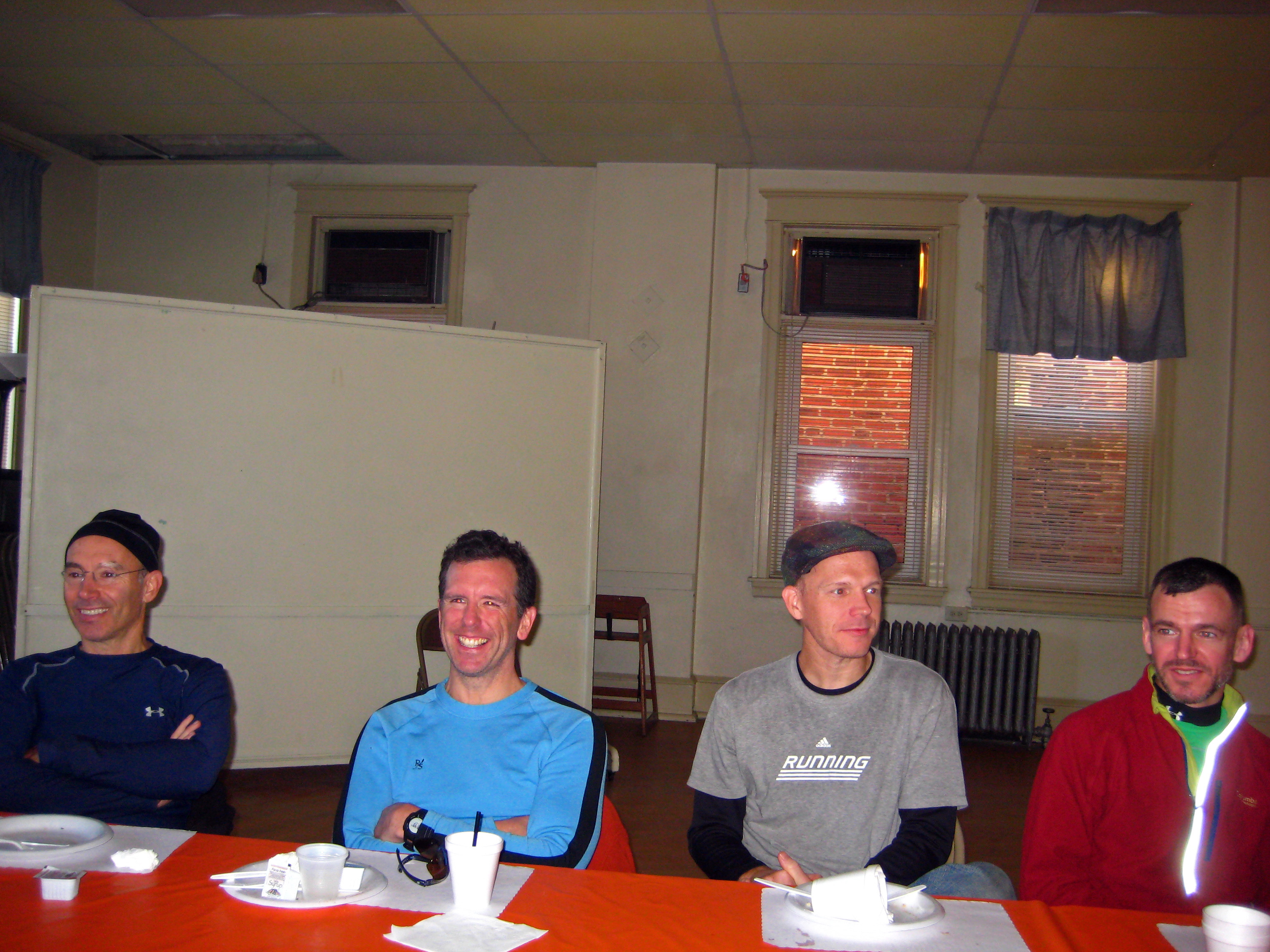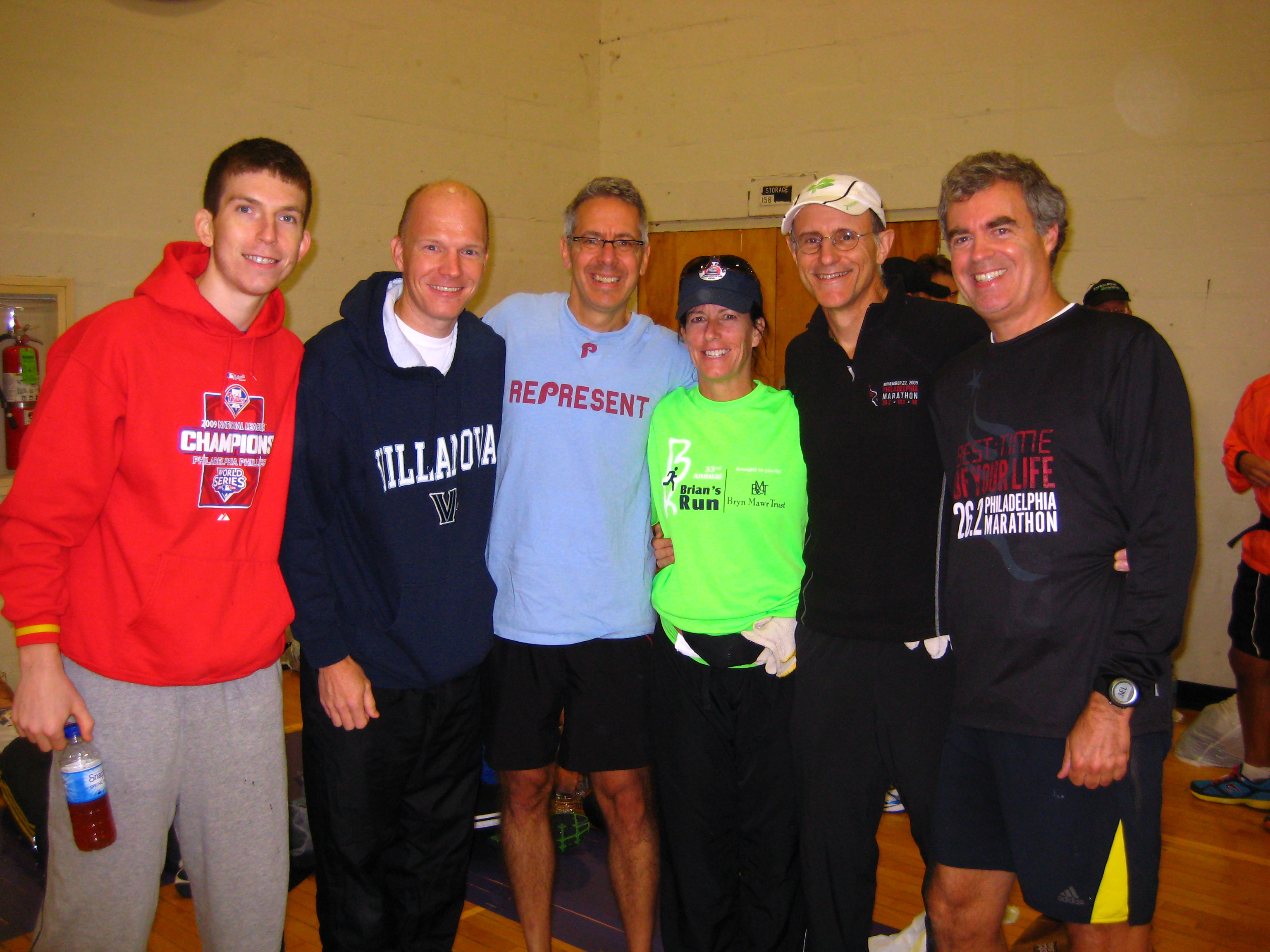 SJAC Marathoners wait in the gym at Forest City, H.S. Dan, Brian, Steve, Lisa, Frank and Tony.