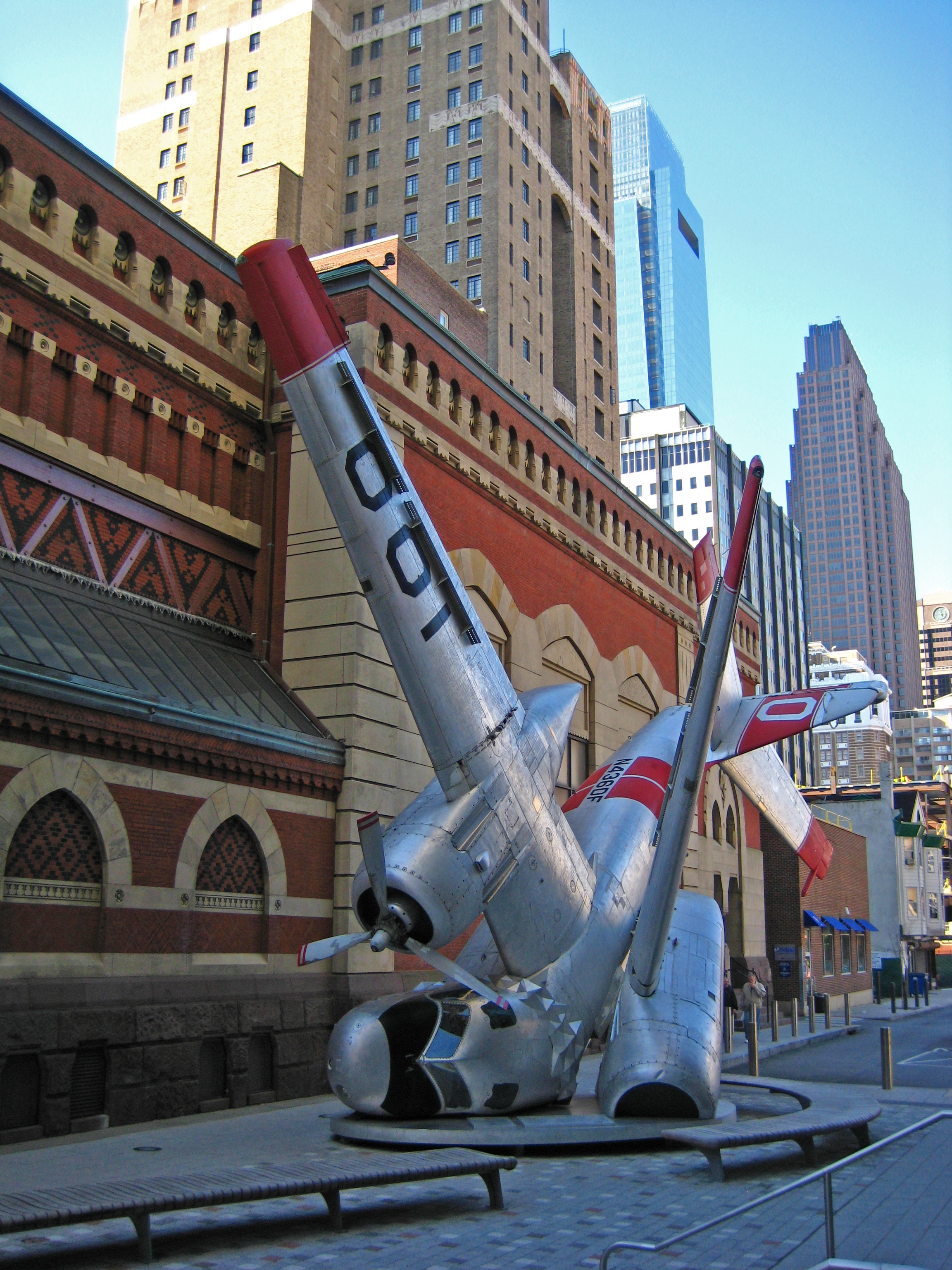 The Pennsylvania Academy of Fine Arts is the oldest art museum and art school in the US, founded in 1805. It is still teaching budding artists today, allied with the University of Pennsylvania. This particular public spectacle, a real Grumman SE-2 Tracker, originally on an aircraft carrier, later used to fight fires in California, was installed by artist Jordon Griska, as if the plane hit the ground nose-first. It is symbolic of swords being turned into plowshares, according to the director of PAFA, and will have a greenhouse built in to the fuselage (from Newsworks.org, a website of WHYY public broadcasting).