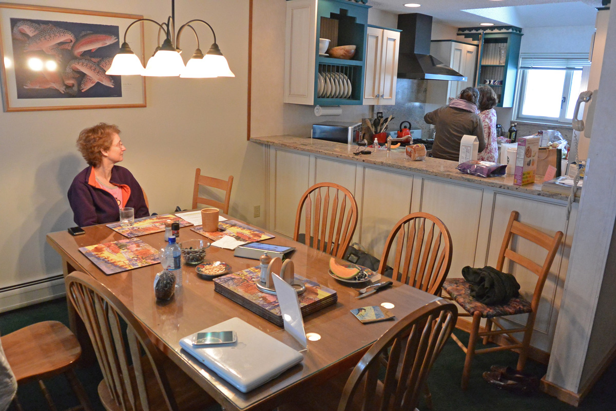 After dumping my bags in the room and skis in the front room of the inn, I joined my friends who had been here for several days already. They were staying in the inn’s annex, which is a converted out building, with a large one bedroom apartment on the first floor, and two smaller rooms on the second. We used the kitchen and living area for meals and hanging out. The group consists of friends from both sides of the Atlantic, the U.S. East Coast contingent and the Londoners. We planned to ski at Pico the next day, which was a Thursday. That’s significant because Pico is closed Tuesday and Wednesday, and with the new snow that fell, we were looking forward to a day of fresh powder, or at least what passes for it in Vermont.
