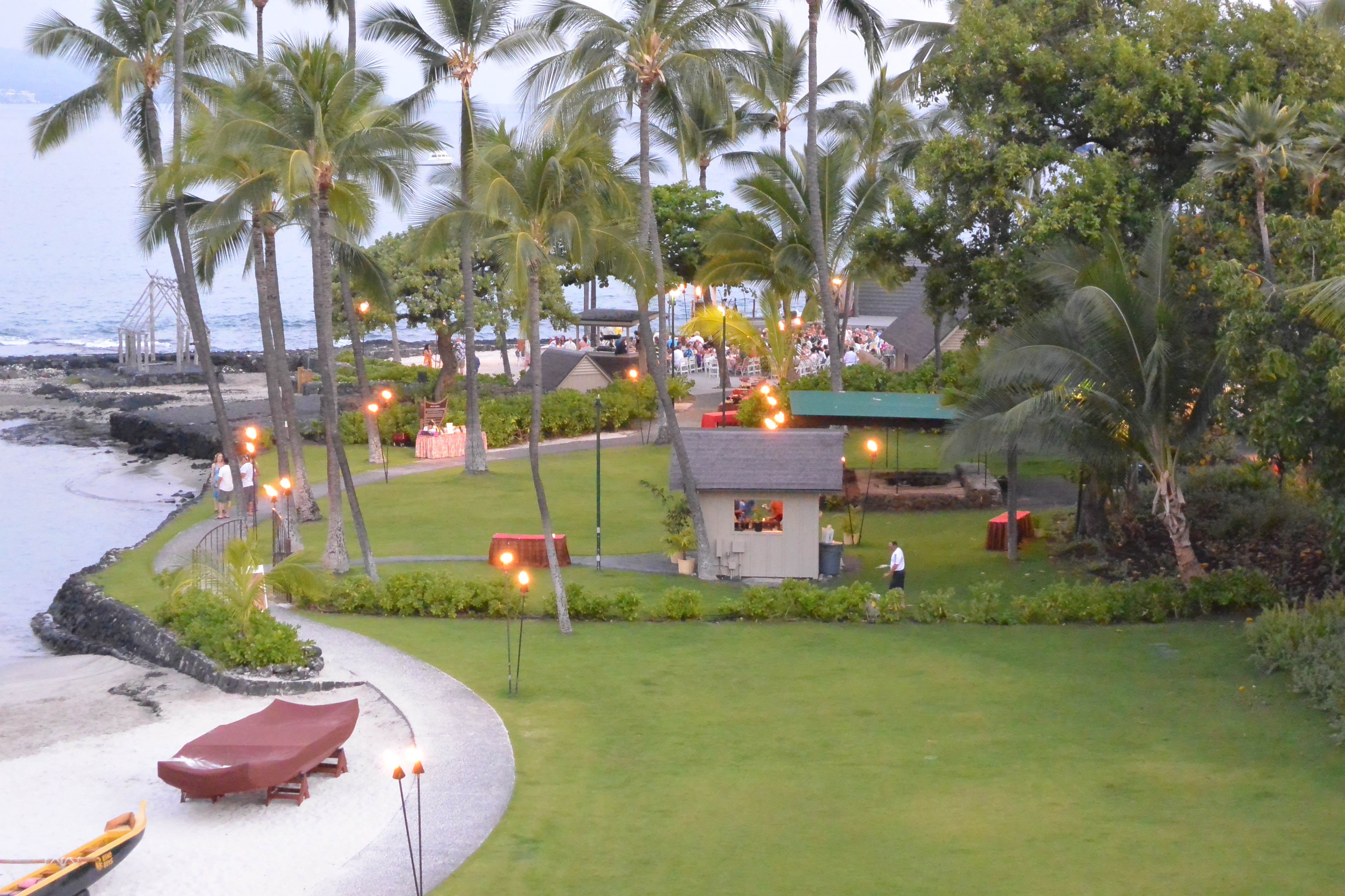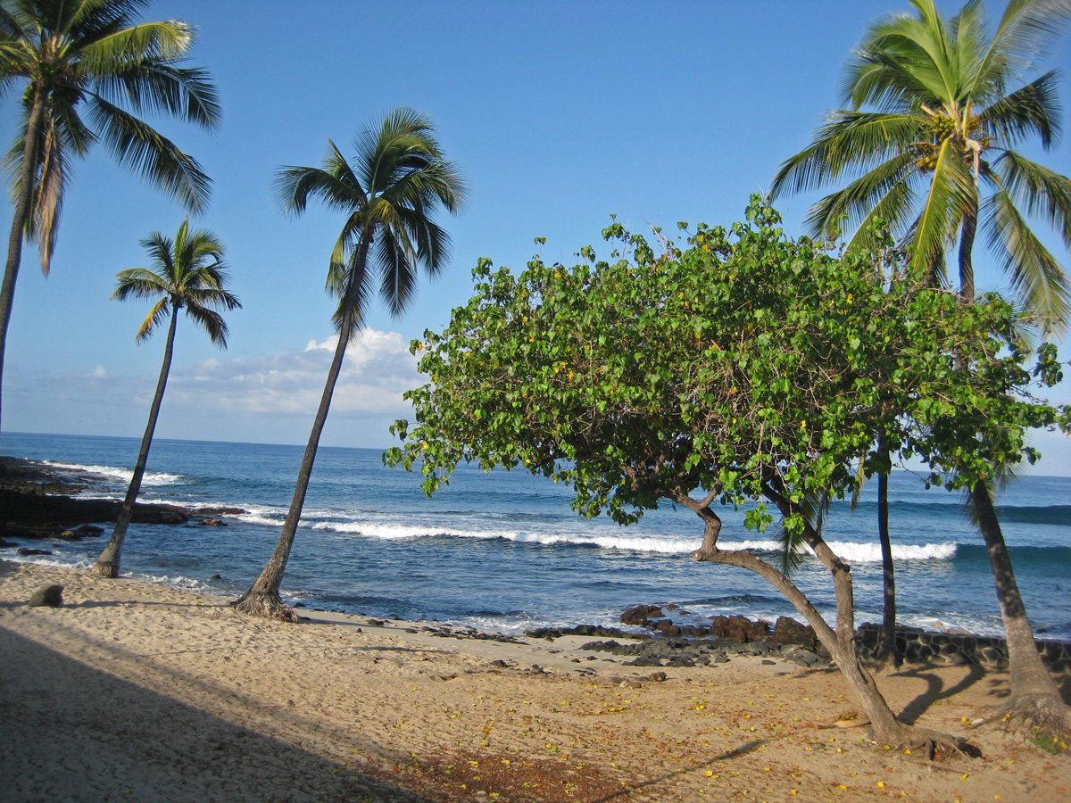 To be sure, I did run, and I’ll get to that, but certainly not as much as I had planned. Since we, being my wife and I, were already on the west coast for my daughter’s graduation, we felt, “why not extend our trip a few days, and have a real vacation”. We decided to take a trip to Hawai’i. Never having been there before, we decided to visit the “big island”, because of the opportunities for adventure. It took a bit of reading to find there are two main airports on Hawai’i, in it’s capitol Hilo, and in Kona. Yes, Kona, the home of the Ironman Triathlon World Championship. Kona is also the more touristy of the cities on Hawai’i, with more hotels, restaurants and bars than Hilo, and it is where we decided to stay. Our flight from San Diego took us eastward first to Phoenix, then we changed planes for Kona. We left San Diego at 6:30 AM, and arrived in Kona at 2:40 PM, a total of eleven hours travel time. It’s not a quick trip. The arrival in Kona, though, is other-worldly, though, as the plane descends over barren lava fields to the airport. Once on the ground, we we disembarked the old fashioned way, by a stairway rolled out on the tarmac. I felt like waving as I stepped through the doorway of the plane onto the stairs. The terminal itself is completely outdoors. No walls, just open air, with some overhead coverage for rain. Exotic looking plants and flowers were in abundance around the terminal. We collected our bags and rented our car without a problem. It was a short drive to Kona and to our hotel. We stayed at the Courtyard King Kamehameha’s Kona Beach Hotel. This hotel is built on grounds of the royal court from the time of King Kamehameha I. It faces a beach, a rebuilt temple of the royal residence, and a pier. The first room they gave us did face the water but was adjacent to a busy street and parking area. They were kind enough to move us to a different room which was much more what I had in mind, overlooking the beach and a grassy area surrounded by palm trees.