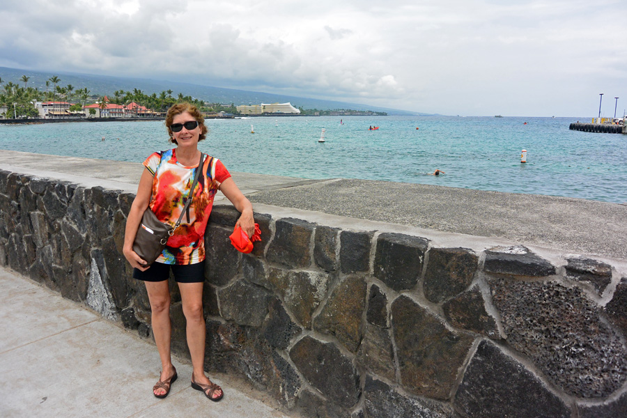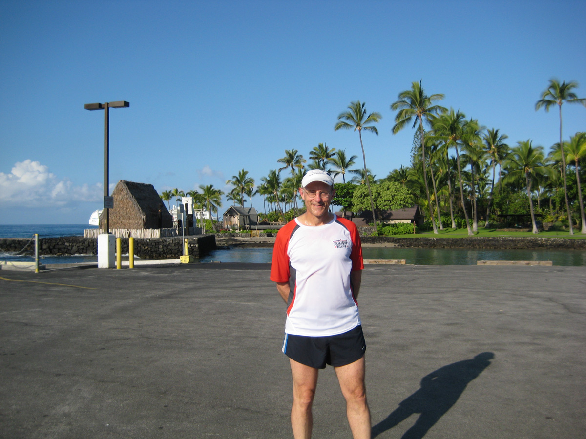 The next morning I awoke feeling frisky and ready to run. I got out at 6:00, which was no problem given Hawai’i is three hours behind west coast time. There are few roads on which to run, so I followed the path most of the runners in this area seem to take, which is along Ali’i road, which runs south along the coastline from Kona. The road is narrow, but does have a shoulder/bike lane, and there were other runners along the route. It is a beautiful route, since there are frequent areas where the waves crashing against the lava rocks are in view. Getting out early, it wasn’t too warm, about 74˚F, but it was very humid. I ran out a bit past the 2.5 mile mark, then turned around and ran back. The road is undulating, with a few hills of significance over that distance.