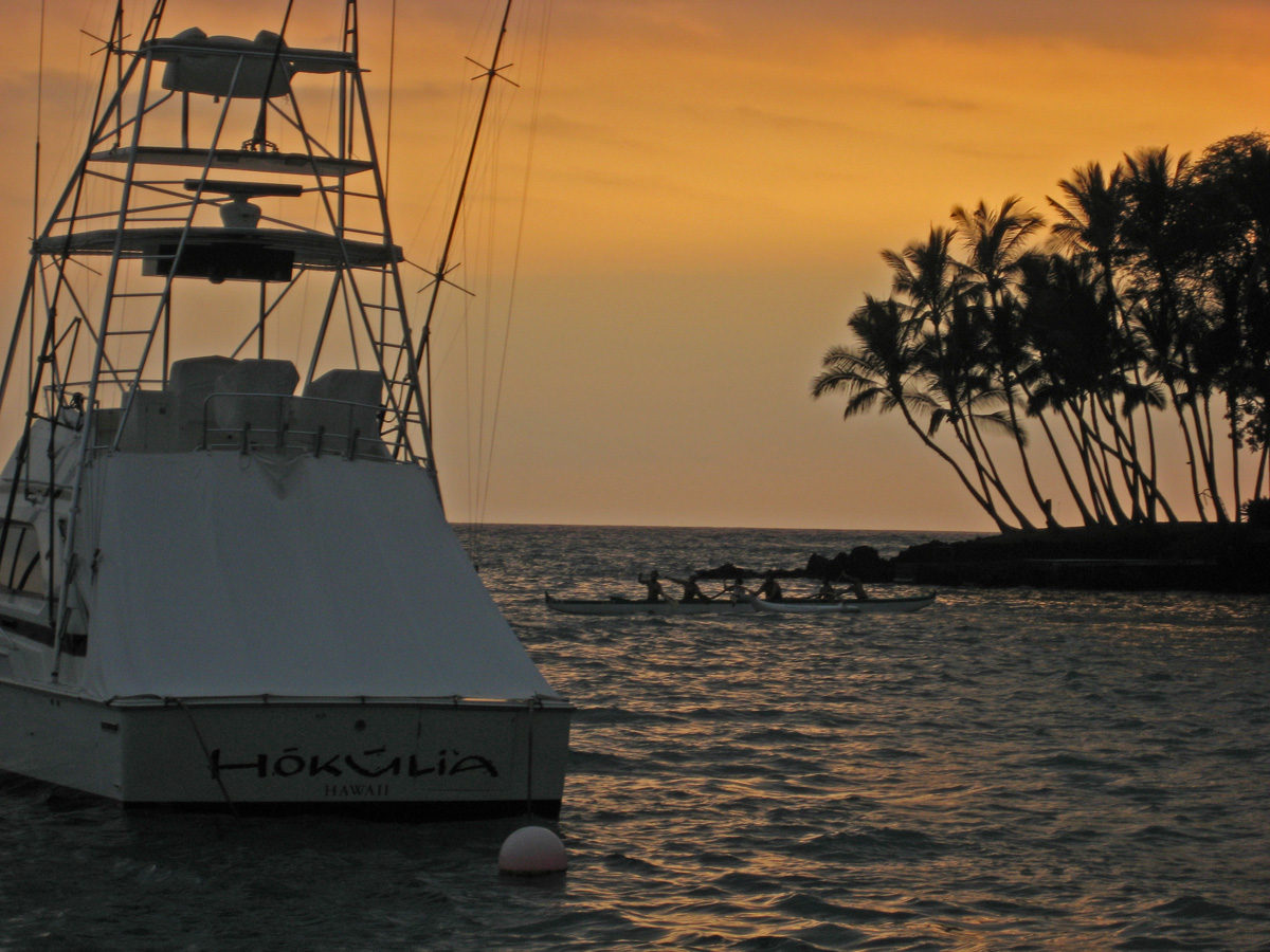 Our search for an ideal snorkeling experience did not turn out as we hoped. The next time we are in Kona, we’ll know how to get to the “two step” beach at Honaunau Bay. That evening, though, we had plans for another expedition. Kona is well known for night time viewing of manta rays. In fact, the guy at Boss Frog’s said if we see the Mauna Kea, see lava, and see manta rays, we’ve done the big three items on his list of the best of Hawai’i. We arranged to go out with Sea Paradise tours, for the boat ride out to what they call “Manta Ray Village”, out of Keauhou Bay.