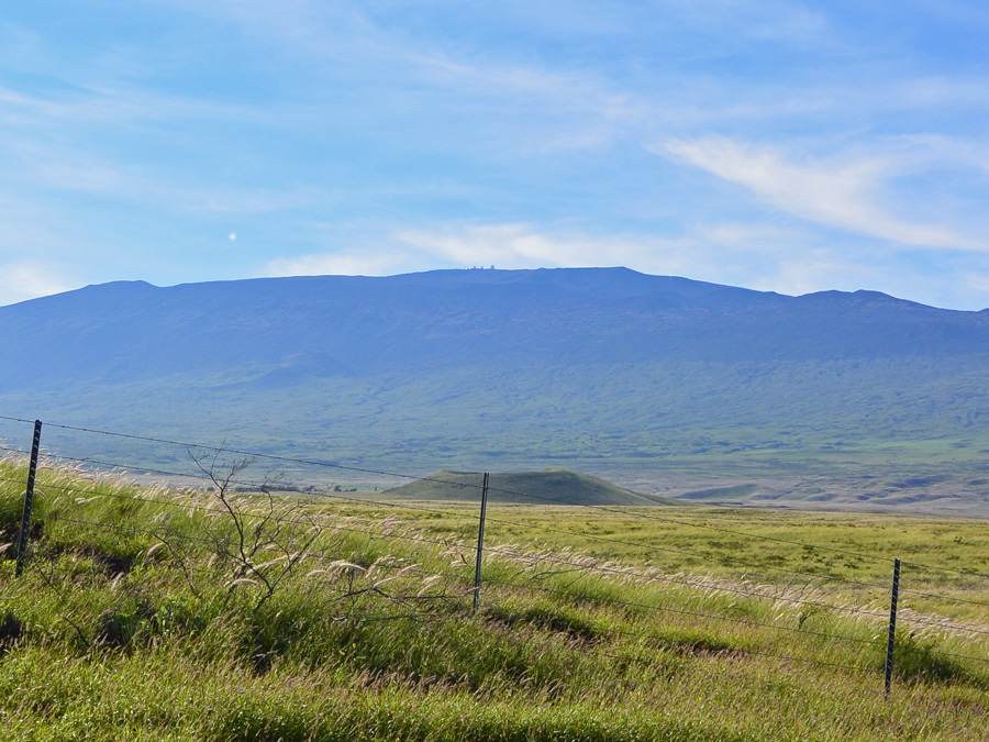 View of Mauna Kea, with observatories visible at the summit, along route 190 heading toward Waimea.