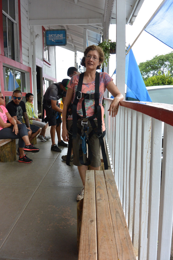 The office is a small, humble one, part of an old building with the other half unoccupied. They seemed very professional and confident, though, so we were not concerned. They have a large tackle box in the office which they call their lock box, and in which one can place items like keys and wallets. It would be unfortunate if items like that slipped out of one’s pocket while zipping a few hundred feet above a gorge. Of course, a clever thief could make off with the whole box, but fortunately, that didn’t happen. The first thing, of course, was to sign the waver holding them blameless for any fate that should befall us. Before heading out, our group of eleven intrepid explorers were fitted with our harnesses. This set of thick nylon straps is the method by which we would be suspended from the zip cable. A few warnings were given. Don’t let your fingers get up to the contraption which has the wheels that zip along the cable. The fingers will go missing. Make sure any items one carries are secured to your person. We were provided with a water bottle (very nice one, by the way, a 700 cc BPA-free bottle with a screw cap, which we attached by a carabiner to our harness. Given the warmth and humidity, the water would be needed.