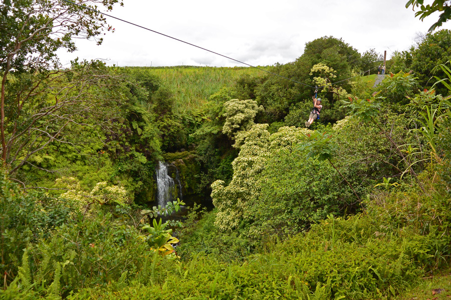 That done, we headed on to the next line. Each zip line was longer than the last, and higher above the ground. Along the way we got to sample some of the local banana crop, which are primarily the Williams and Apple type. These, until recently, could not be shipped to the mainland due to fruit flies which might travel with them. We were able to pluck them from the tree. They are smaller, and quite a bit sweeter, than bananas back home.
