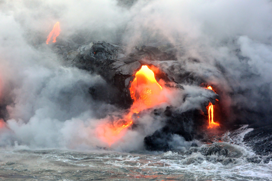 The closer we got, the more the water was churning,reacting to the flow of molten rock