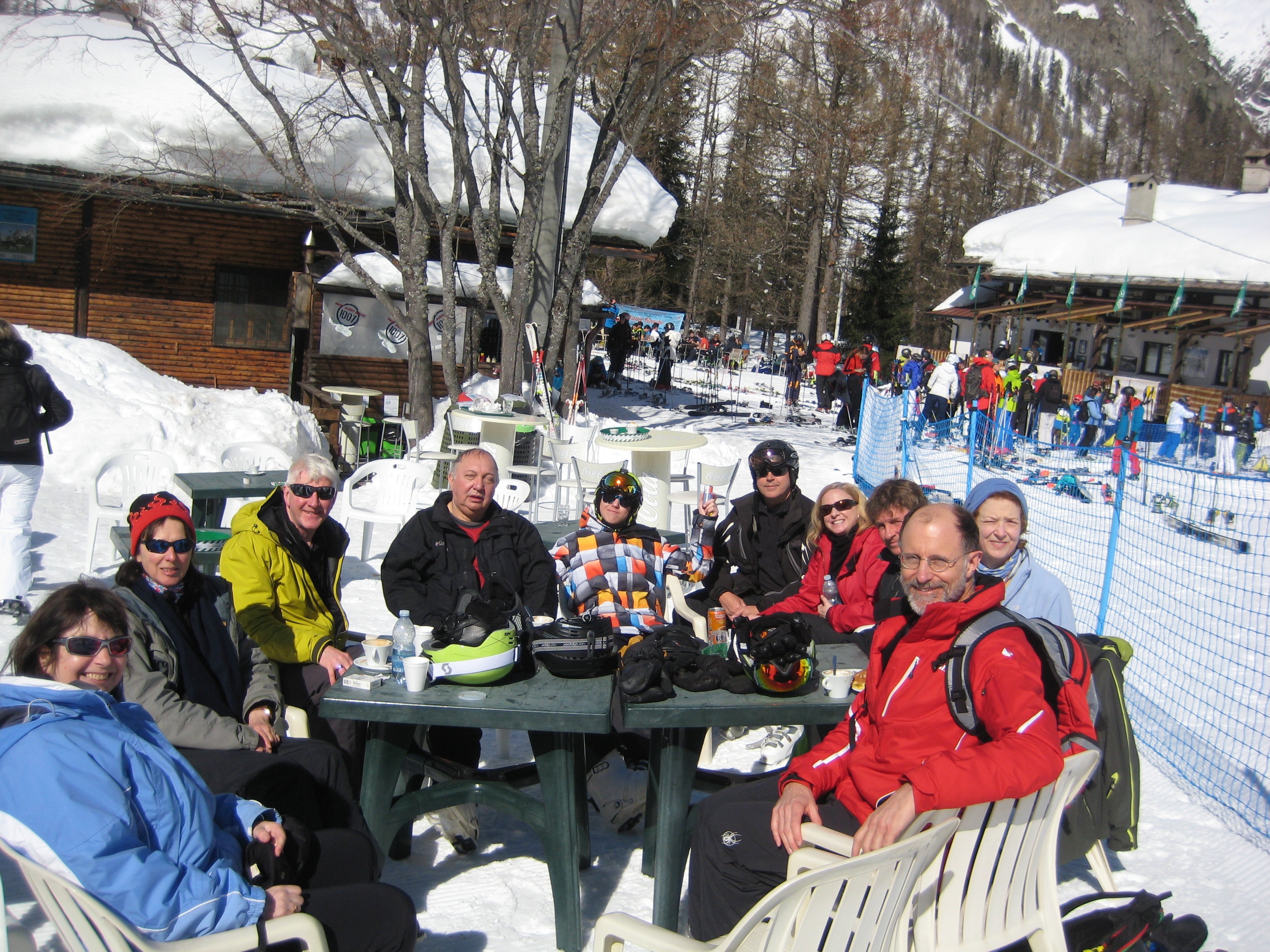 Teresa, Christine, Simon, AJ, Drew, Eric, Jen, Paul, Kristine and Frank enjoying a break in Courmayeur. Thanks, Will, for taking the photo.