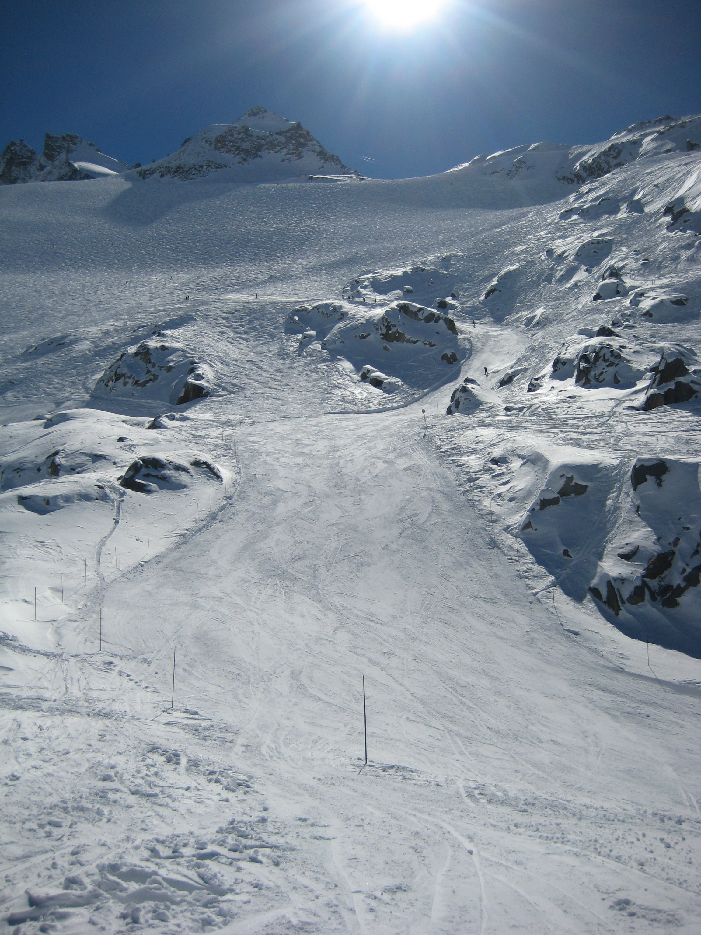 Chamonix is famous for extreme sports, winter sports, and mountain climbing. The mural above shows early, formative members of the Compagnie des Guides de Chamonix, an association for the guides in this region. The woman depicted at the top, Marie Paradis, at the time a worker in a hotel, was the first woman to climb to the summit of Mont Blanc, in 1808. Chamonix was the home of the first Winter Olympics, in 1924. Mont Blanc, the tallest mountain in Europe, can be seen clearly from the town, and is a primary attraction here. The Vallée Blanche is the ski route off of Mont Blanc, accessible from L’Aiguille du Midi, the highest reaching cable car in the valley. It is unmarked, unpatrolled and quite a challenging run. I did this run in 2003, with a group from Philadelphia, led by a guide named Christian.