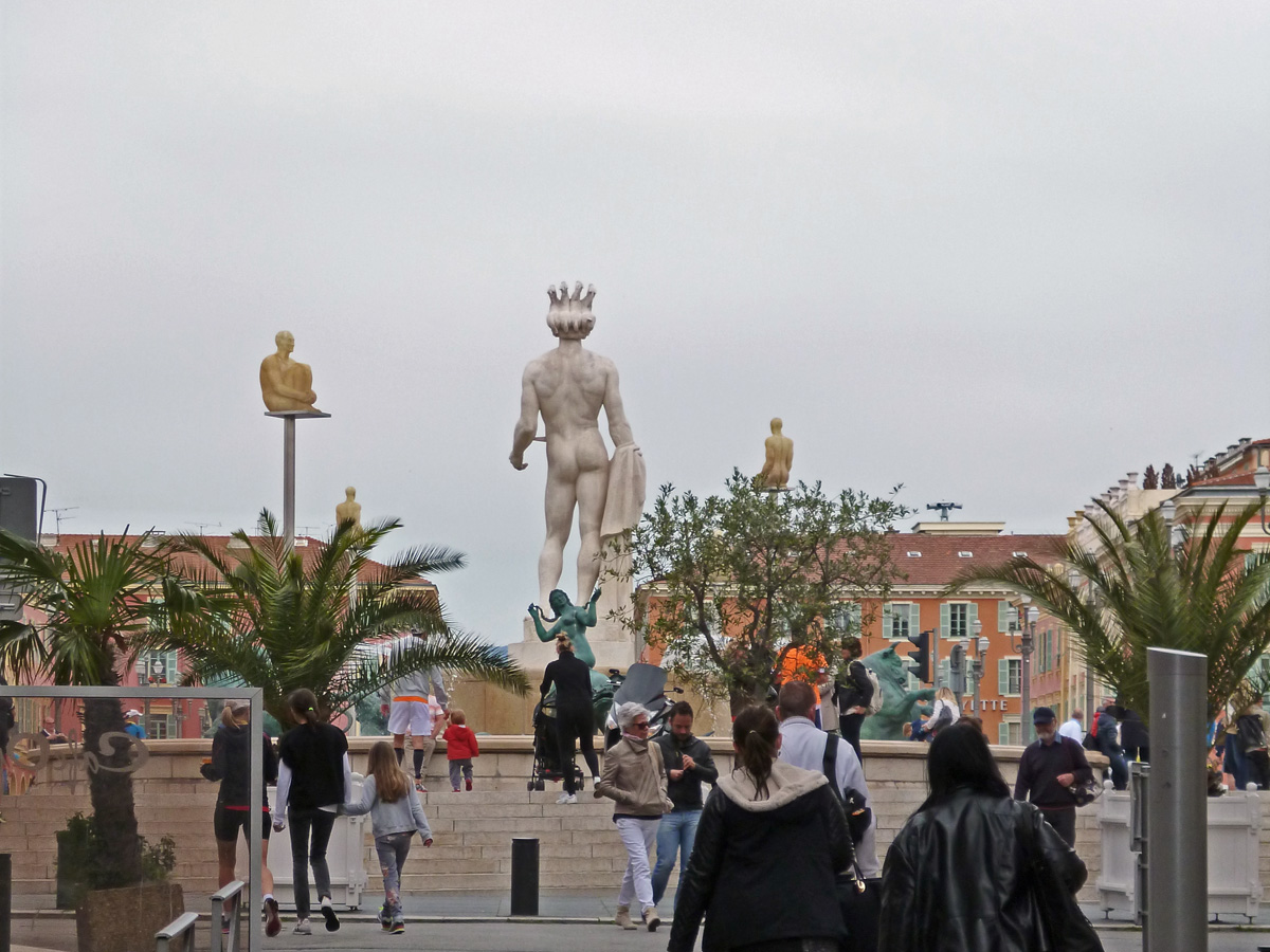 Walking down to the start, we passed through the beautiful Place Massena, bordered on both sides with spouting fountains from large rectangular paved areas. Seven tall poles holding up sitting figures represent seven continents which are lit from inside with colors that change, representing conversations. The centerpiece, a very large (7 meter tall) nude statue of Apollo surrounded by his planetary helpers, was a controversial piece when first displayed and spent some time on the outskirts of town until it was moved back in 2011. Finally, the buildings behind the statue are elegant, stately and make a striking backdrop.