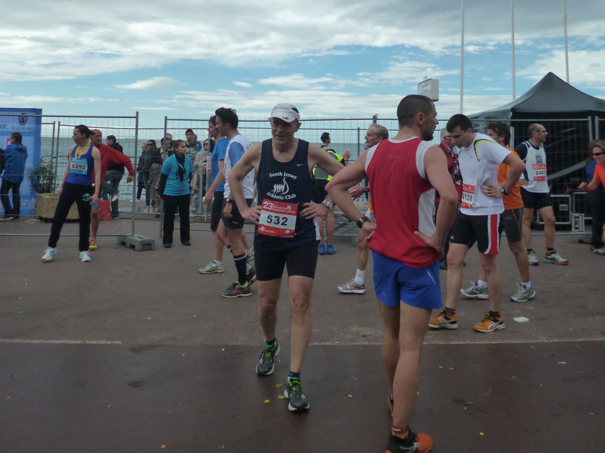 The total starting the race, including both the semi-marathon and the 10K, which started together, was about 5,300. The 10K runners ran the first half of the semi-marathon course which circled through the streets of Nice. Then the semi-marathon course continued out along the Promenade des Anglais to the Nice airport, turned and headed back along the same route to the finish line.