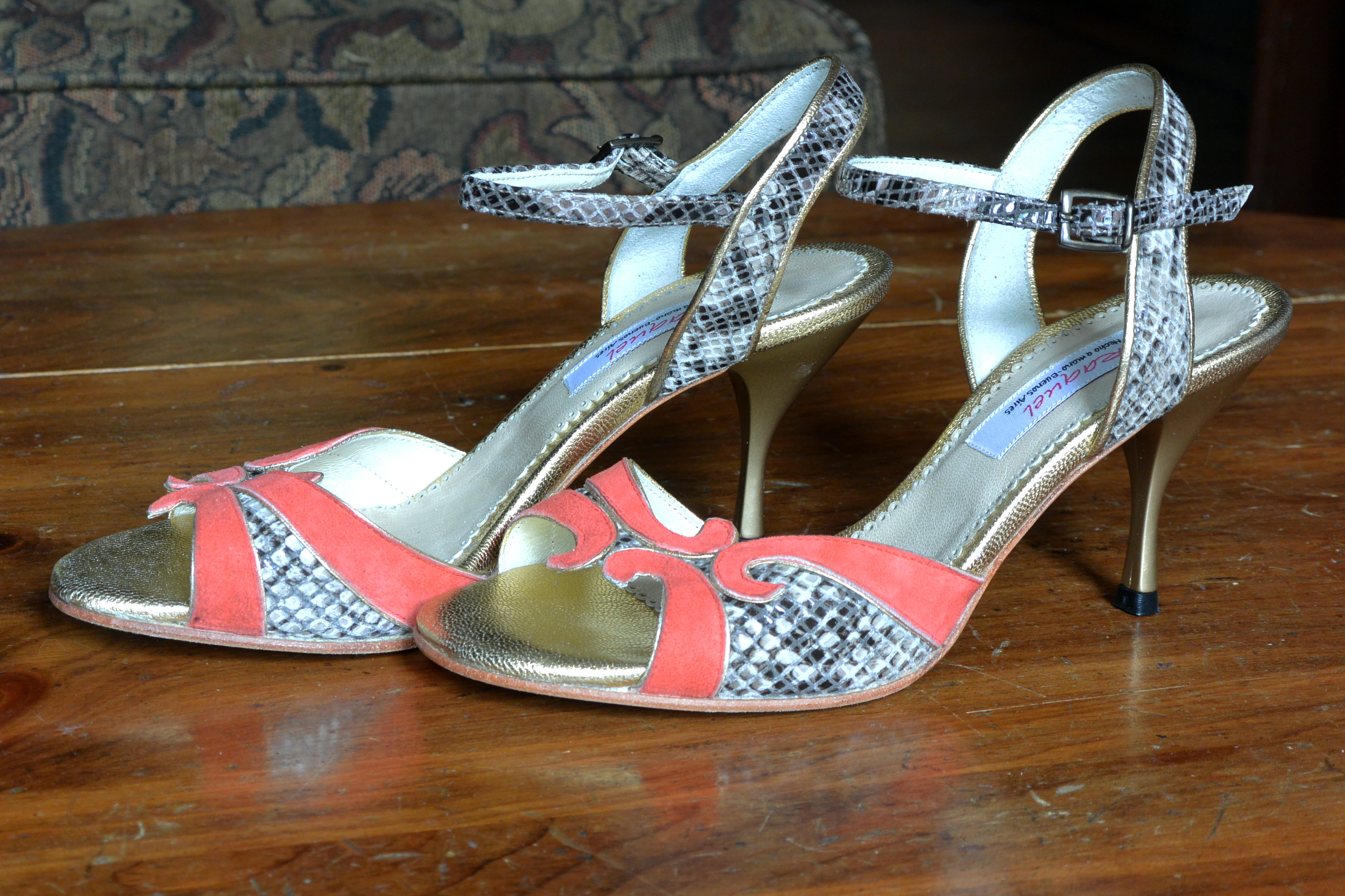 Particularly for women, there is the excitement of the shoes.  Tangueras (the ladies) get absolutely obsessed by the tango shoes, stylish high heels costing hundreds of dollars, built by hand in the shoe salons of Buenos Aires.  If a woman enjoys tango, she may go to Buenos Aires for the sole purpose of buying shoes.  Of course, they need to fit just right, and be supportive for dancing in addition to making the other women furious with envy.  We spent one afternoon chasing this dream on our recent trip.  The address of the salon led us to a tall, narrow building on a busy street with a locked door and the typical push button list of occupants.  There was no sign indicating a shoe salon, and no labels on the brass plate with the buttons to show which one to press.  We were wondering if we were in the right place, when another customer came up, pressed the right button and got buzzed in.  She indicated we were indeed in the right place.  The building inside was old with a very high ceiling and elegant, but with the look of an office building.  The elevator was a classic ancient elevator, tiny with glass doors.  There was room only for our wives and the other customer, so my friend Roger and I ascended the stairs and met the women on the third floor, which was, English style, three flights up.  Through the unmarked office door we went, and were greeted by a young woman in charge of her shoe salon.  She had samples on shelves around the waiting area, with thin leather straps, colorful combinations of prints and designs, and very long slender heels.  Several other women were there trying on shoes.  This is the ultimate in shoe buying experience.  We went to several other shoe salons during the trip that were not so secretive, but this one topped them all.