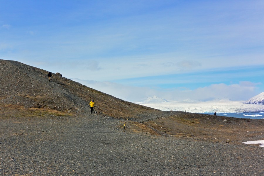 Ascending the gravelly hill overlooking Jökulsárlón.