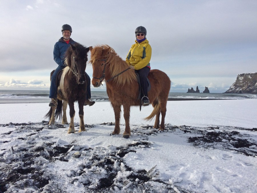 Frank and Kathleen riding Icelandic horses on the black sand beach covered in snow in Vik.