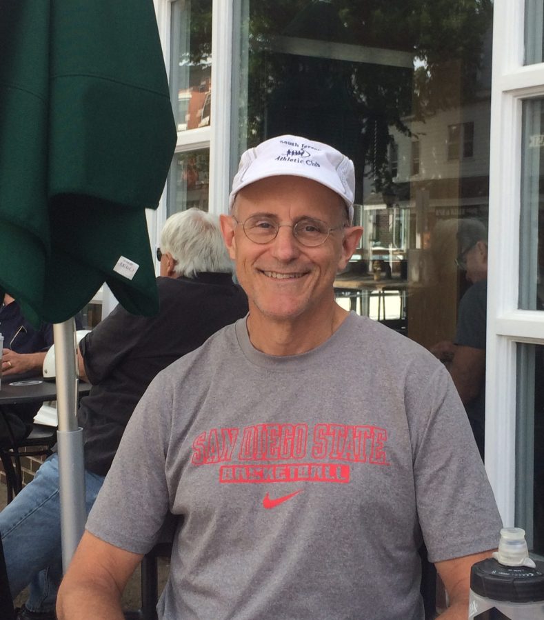 Frank relaxes at Starbucks with his running friends, 20.2 miles in the training bank.