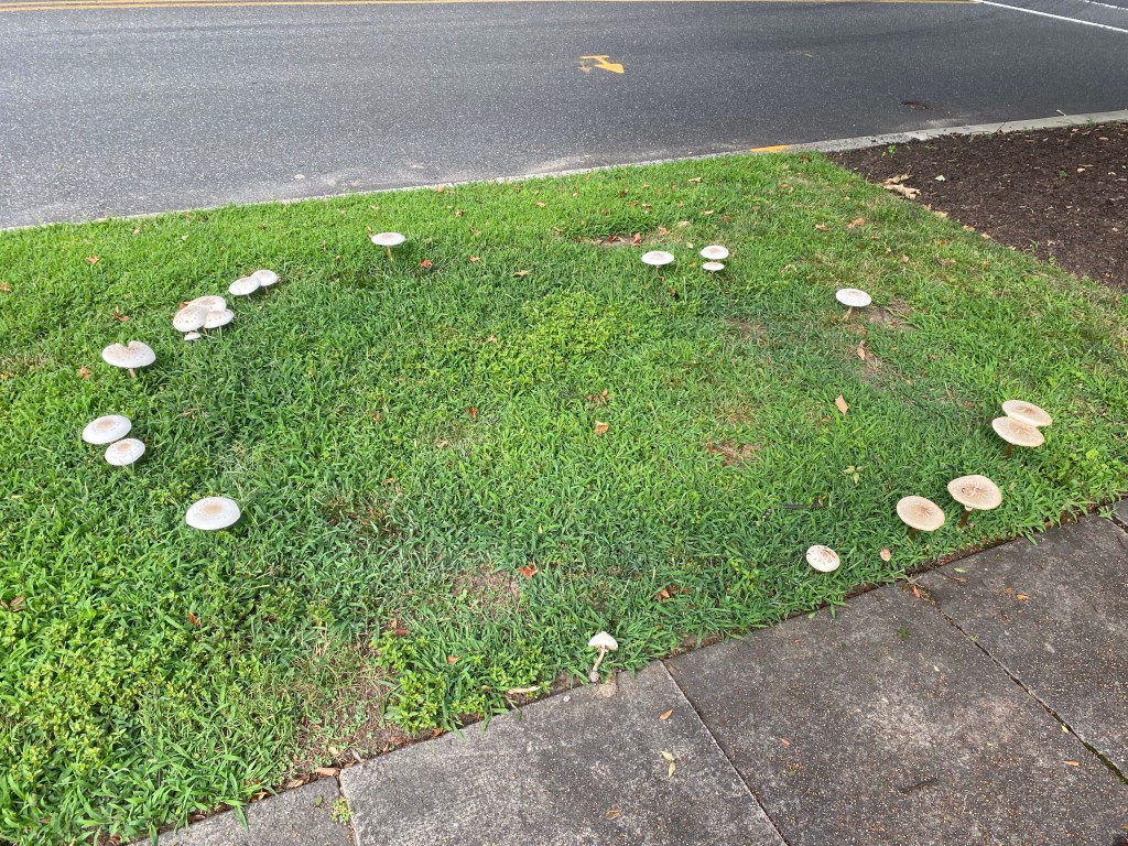This is a fairy ring. Depending on your culture, it can be evil or good, but evil, witchy or hedonistic elfin seems to win out. If you look carefully, you will notice the darker ring of grass where the mushrooms are popping up. The mycelium, an outward spreading network of hyphae, causes this appearance. Hyphae are the strands of multicellular growth of fungi, in this case, underground, which allow for propagation. Where the mushrooms are popping up, the hyphae are secreting enzymes which digest nutrients outside the hyphae, allowing them to diffuse back into the hyphae and support growth. As part of this, nitrogen compounds are released into the soil for the nourishment of the hyphae, but are also available for grass roots to use, making the grass taller and darker.