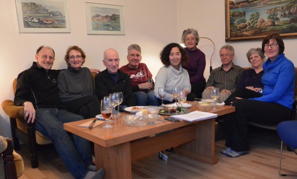 As predicted, the descent back to the center was treacherous, mainly for me. Simon, with his advanced cross country skills had no trouble negotiating the tricky downhill segments. I, on the other hand, had all sorts of trouble, basically controlling the descent about three quarters of the way down each switch back turn, then wiping out. The conditions were not ideal for a newcomer to the sport. The warm day left the snow soft and wet, not dry and crisp which would have been manageable. At one point I had to take off a ski to get back up, and quickly discovered the idiocy of that move. The ski slipped out of my hand, and with no ski brake as on an alpine ski, it easily skittered off into the woods. Fortunately, it hit a tree and stopped. I went tromping after it in deep snow, almost up to my hip, but managed to get the ski back and crawl back up onto the trail. I walked about fifty feet downhill, to a flatter segment, and put the skis back on. Amazingly, Simon had patiently waited for me, and we went together the last kilometer or so down to the ski center. As we descended further, a tall, somewhat natural looking woman, dressed in sweat pants and a long sleeve cotton T-shirt, who had been skiing circles around us, passed in the opposite direction and said, “congratulations, you conquered Bear Hill,” and flew by for another loop. The others in our group had long since finished their experiment with cross country, and were ready to depart.